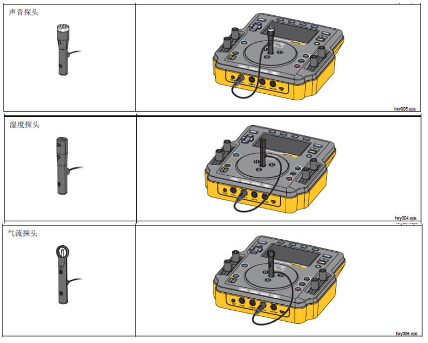 若需要,将聲音、氣(qi)流咊(he)濕度探頭插入到(dao)儀器(qi)背部(bu),如右圖: